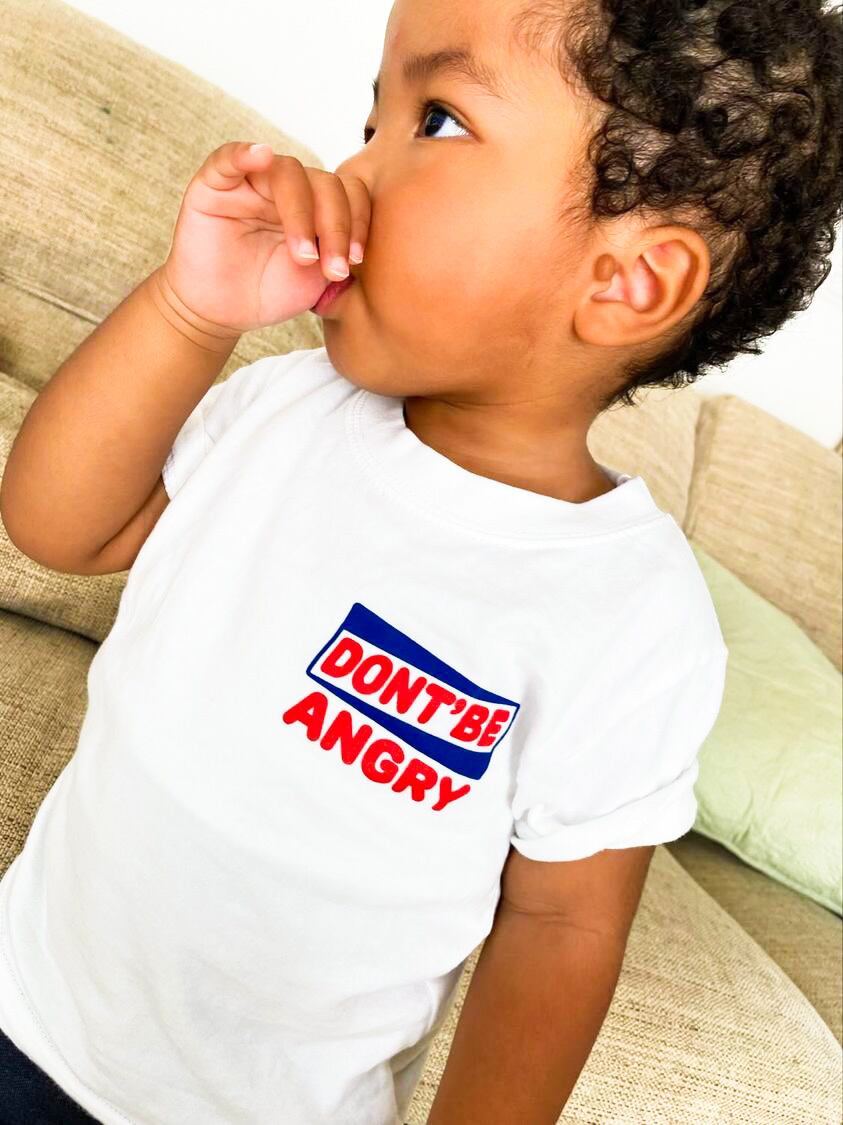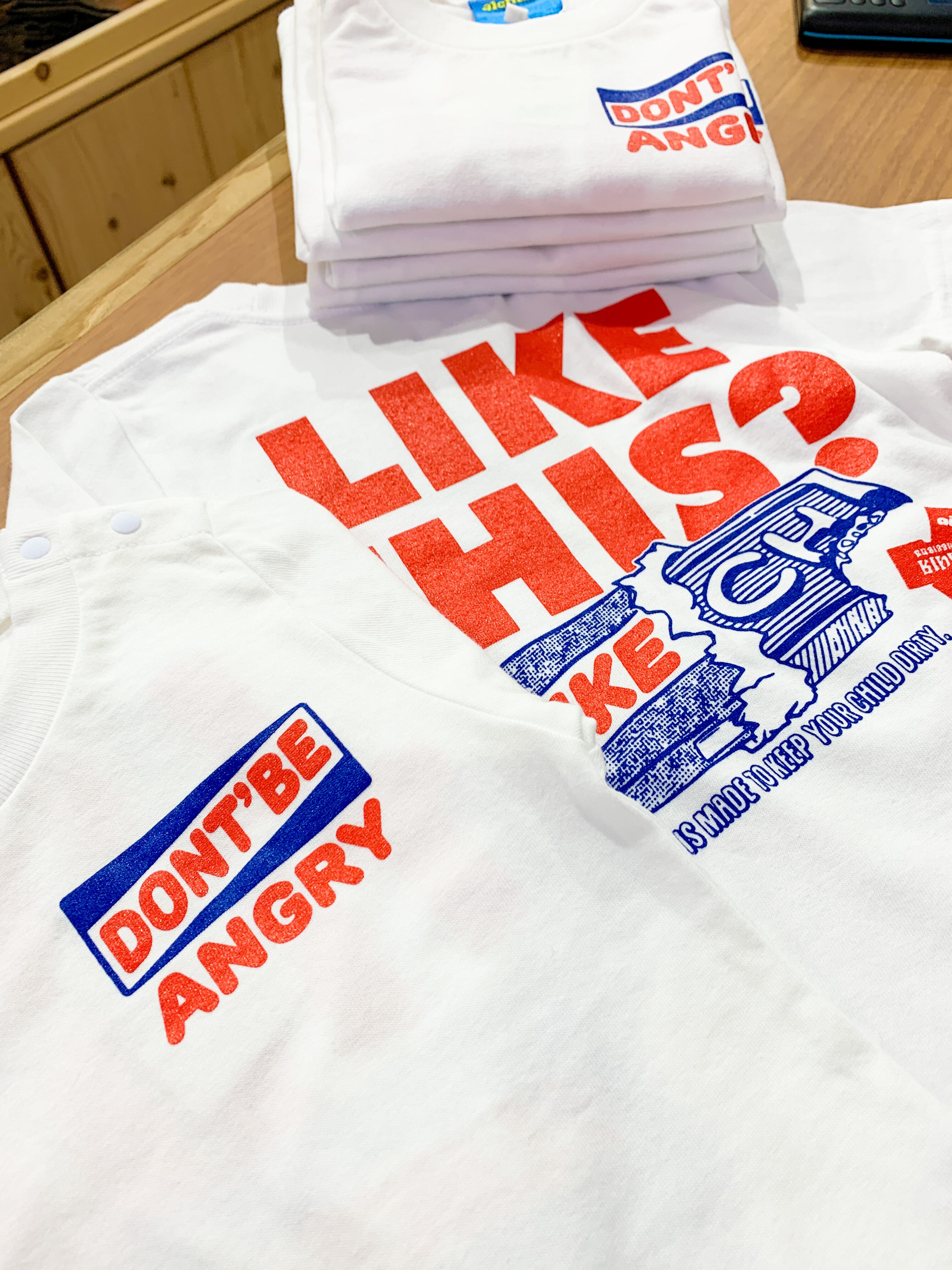 フロントには「Don’t be angry(怒らないでね) 」のロゴをあしらい、このTシャツを汚してしまったキッズには怒らず。むしろ汚れをアートとして褒めてほしいという思いでデザインしました。