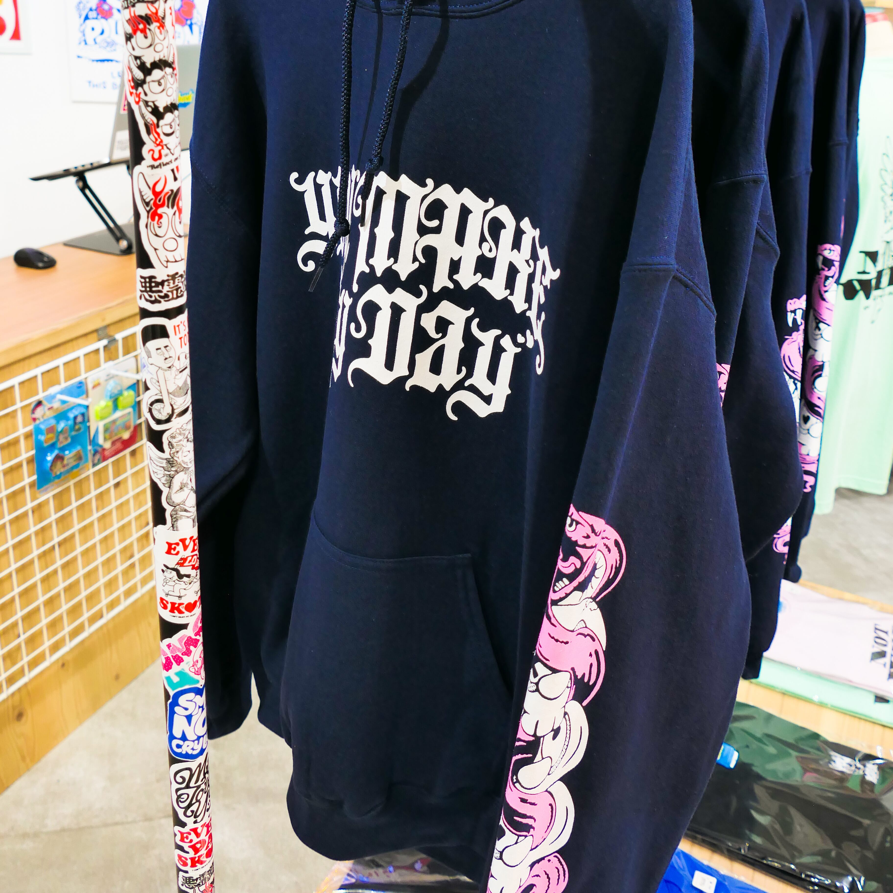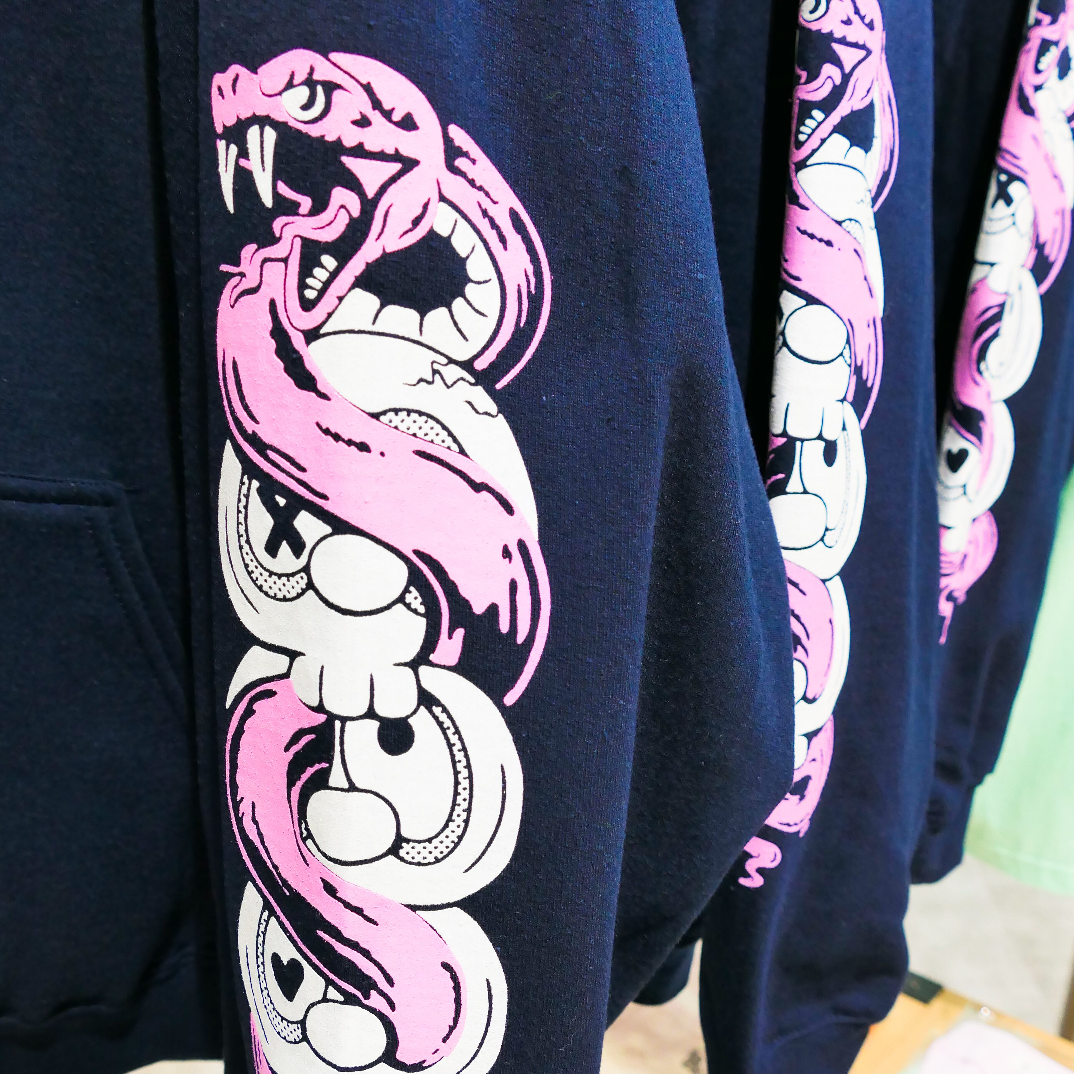フロントには、いかつくも可愛いフォントロゴを落とし込み左袖には書下ろしのSNAKEイラストをシルクスクリーンプリントしています。